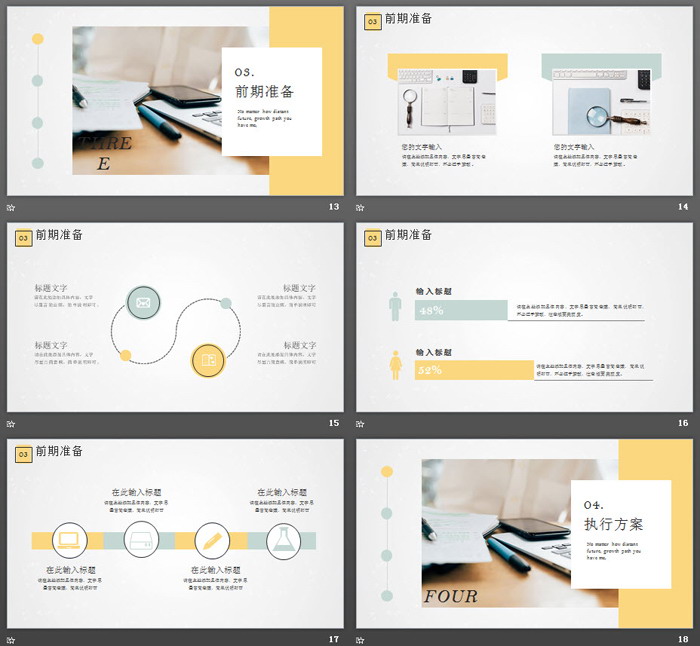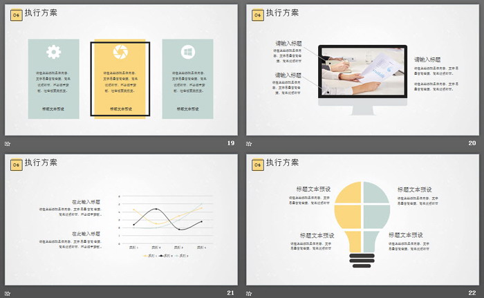 PowerPoint模板内容页,由23张淡雅黄绿PPT图表制作。另外使用了多张清新风格的商务图片排版。