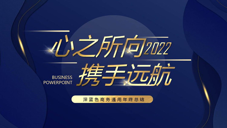 PPT模板封面使用了蓝色动感图案背景图片。中间使用金色渐变字体填写,心之所向 携手远航 2022年终工作总结PPT标题。界面风格大气高端。