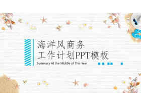 PPT模板封面使用了沙滩、海螺、海星、贝壳等海洋元素背景图片。中间填写工作总结计划PPT标题文字。界面风格清新商务。