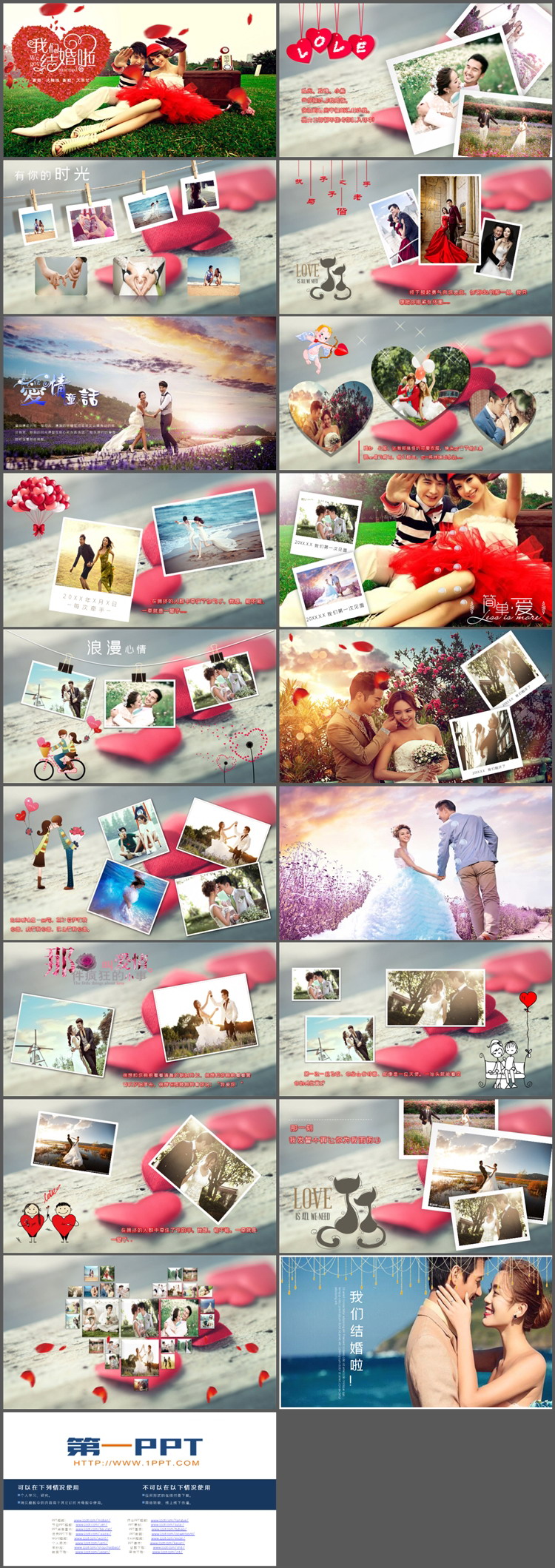 这是一套“我们结婚啦”新婚蜜月纪念相册PPT模板,共19页;