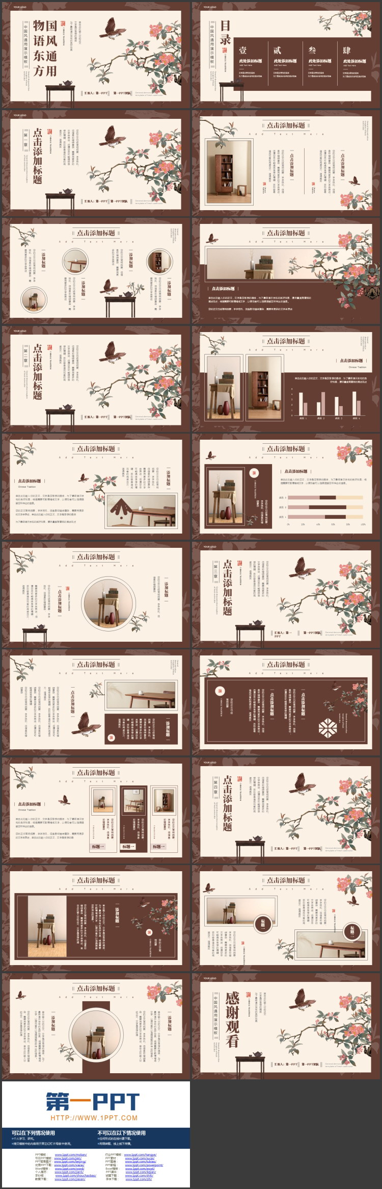 PowerPoint模板内容页,由18张褐色动态幻灯片图表,搭配PPT文字排版组成。另外使用了中式家具插图、水彩花鸟插图等装饰。