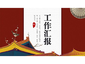 PPT模板封面,使用了红色背景色、古代建筑背景图片。中间填写工作汇报PPT标题。界面为精美中国风格。