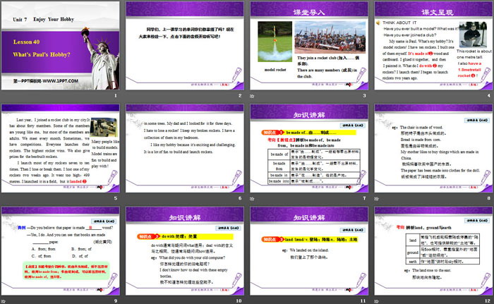 (2)重点短语:be made of…, do with, give prizes for…, a 1.8-metre-tall rocket 等。