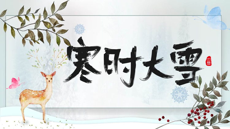 PPT模板封面,使用了卡通小鹿背景图片、树叶背景图片。右侧填写寒时大雪PPT标题,设计风格为精美卡通风。