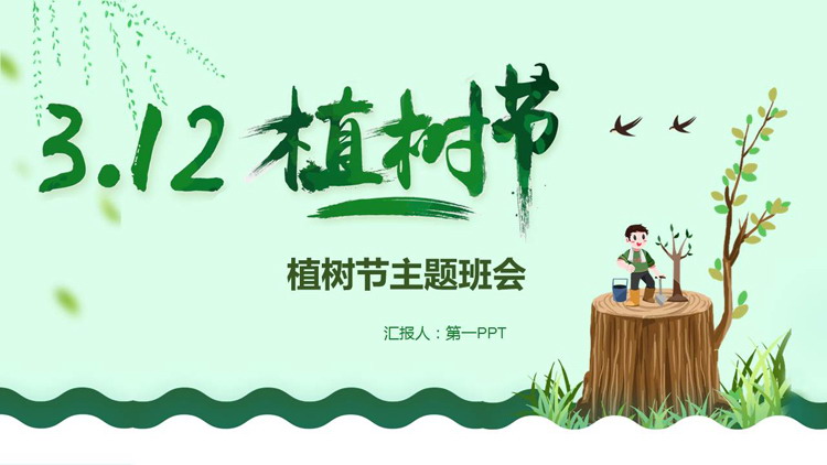 PPT模板封面,使用了卡通树桩背景图片、植树的小孩背景图片。左侧填写“3·12植树节”主题班会PPT标题。界面风格可爱卡通。