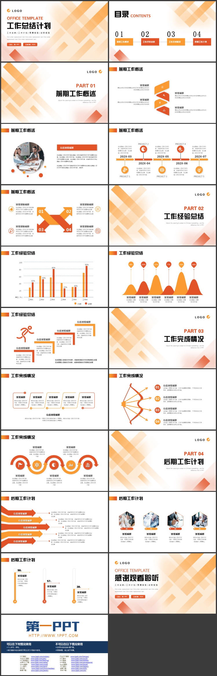 这是一套红橙斜线背景的工作总结计划PPT模板,共20页;
