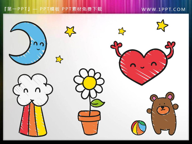 素材包括:卡通风格的小熊、爱心、小花、彩虹、星星月亮、太阳、小乌龟、小蜗牛、小房子、小树、蝴蝶、七星瓢虫、小狗、小鸡、小兔子、雨伞、小女孩、小男孩等。.PPTX格式;